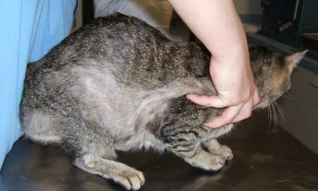 - Bulu Menipis atau Botak (Alopecia): Terutama di area perut, kaki bagian dalam, dan punggung. Bulu terlihat seperti patah atau tercabut.